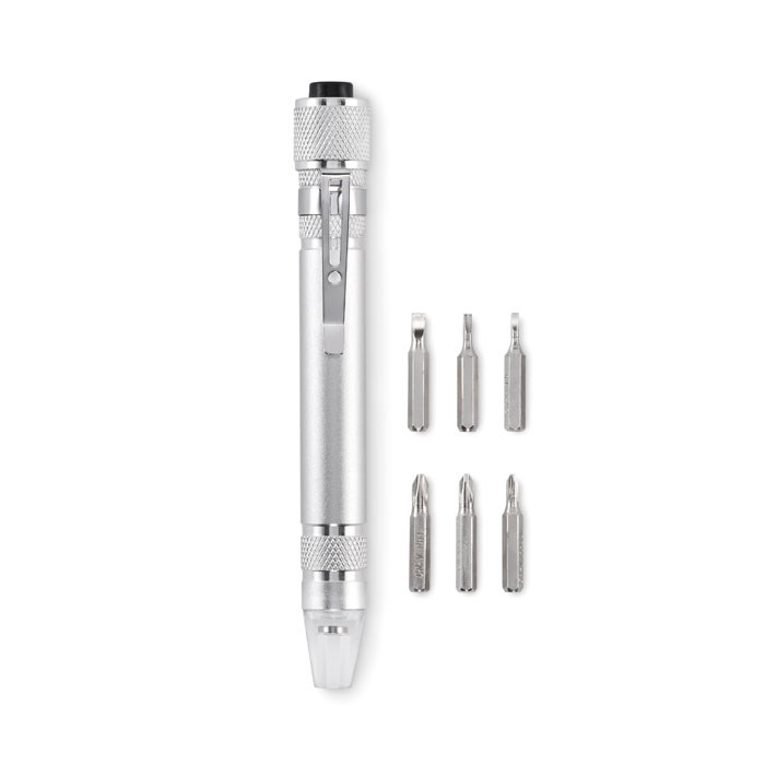 Recycled aluminium multi tool in pen shape with torch. Includes 3 slotted and 3 Phillips screwdriver heads. 4 button cell LR41 batteries included.