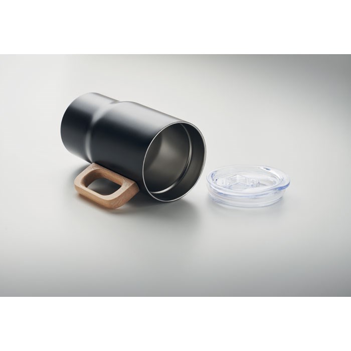 Double wall tumbler in recycled stainless steel (90% recycled stainless steel and 10% stainless steel) with wooden handle. Capacity: 350 ml.