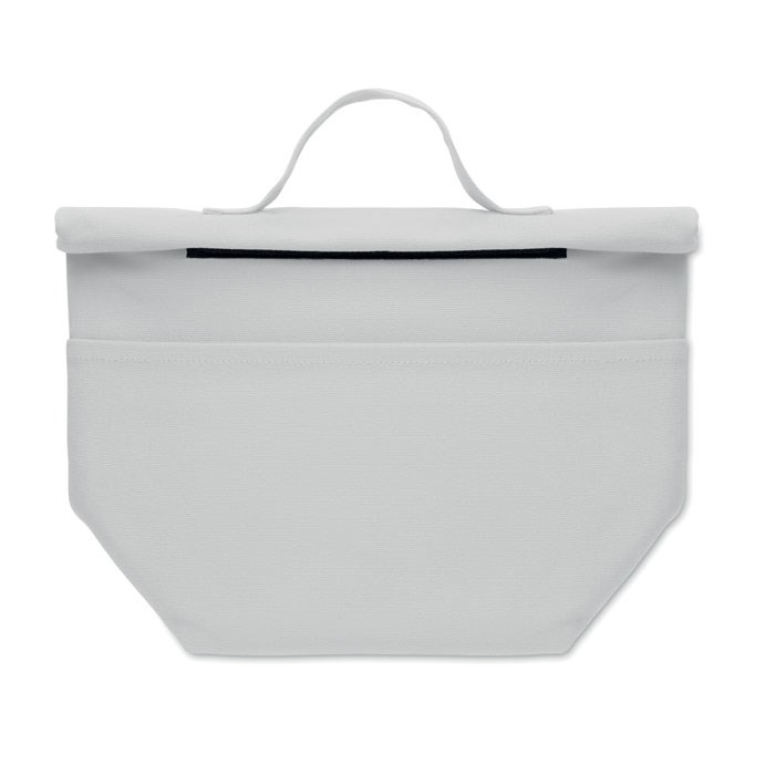 Recycled cotton (70% recycled cotton, 30% recycled polyester) insulated lunch cooler bag with rolltop hook and loop closure. Insulation: 3mm PE foam with 12C PEVA.