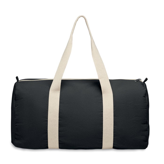 Duffle, sports or travel bag with zippered side compartment and zippered inner pocket in 320 gr/m² recycled cotton (80%) and recycled polyester (20%) with long handles.