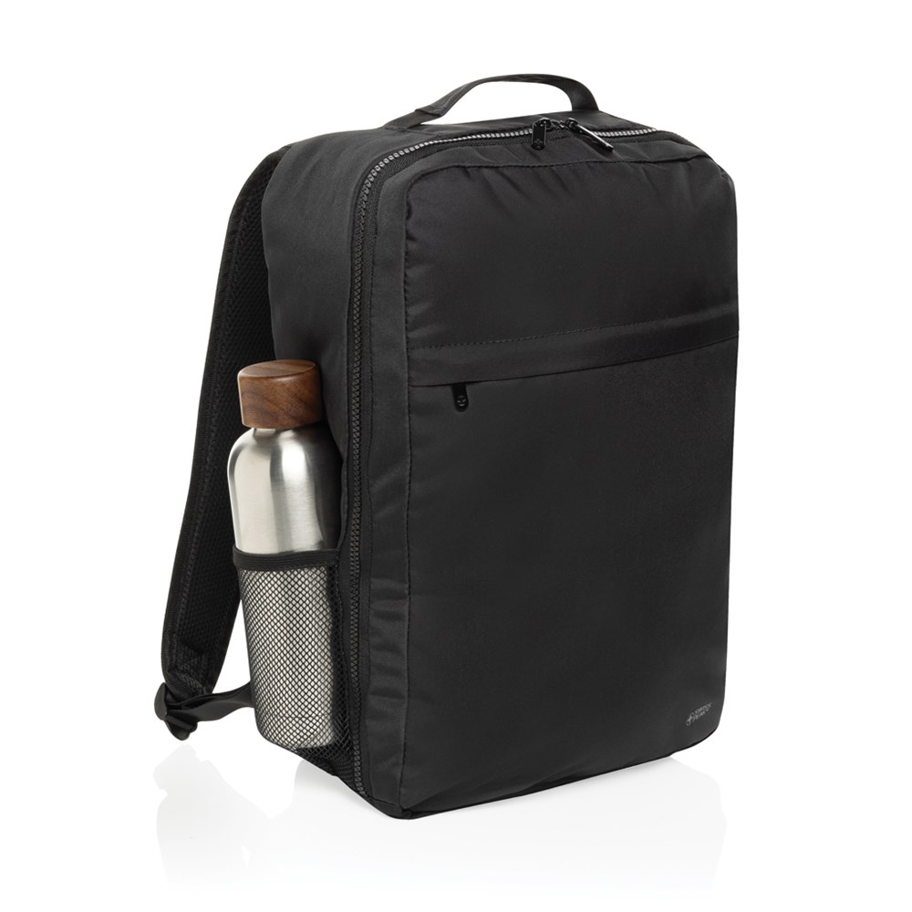 The Swiss Peak Aware™ RPET Essential 15.6 Inch Laptop Backpack is designed to meet your everyday business needs. Made from 100% rPET, this sleek and durable backpack features a main zipper compartment with a dedicated laptop section that fits modern 15.6-inch laptops, along with a mesh zipper pocket and care label inside. The adjustable shoulder straps with buckles ensure a comfortable fit, while the front zipper pocket and side drink holder pocket provide additional storage. The bag also features a convenient luggage strap on the back and a webbing handle on top for easy handling. The tonal Swiss Peak logo and premium Swiss Peak zippers complete its professional look.Made with recycled polyester embedded with the AWARE™ tracer. 2% of proceeds of each product sold with AWARE™ will be donated to Water.org. PVC free.