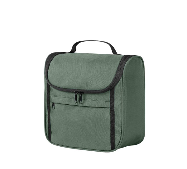 attractive hanging or standing toiletry bag; recycled outer fabric; zippered front pocket; front loop strap; three-sided 2-way zipper; zippered pocket in lid; four mesh pockets inside; handle
