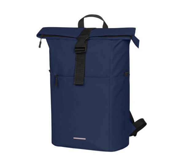practical roll top rucksack; recycled outer material; large main compartment with zipper and additional press stud; attractive reflective print; RPT outer material; large padded pocket; airtag pocket; large front pocket with zipper; two side pockets, e.g. for a water bottle; padded carrying system; handle