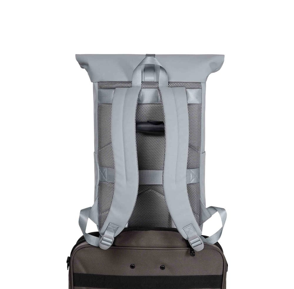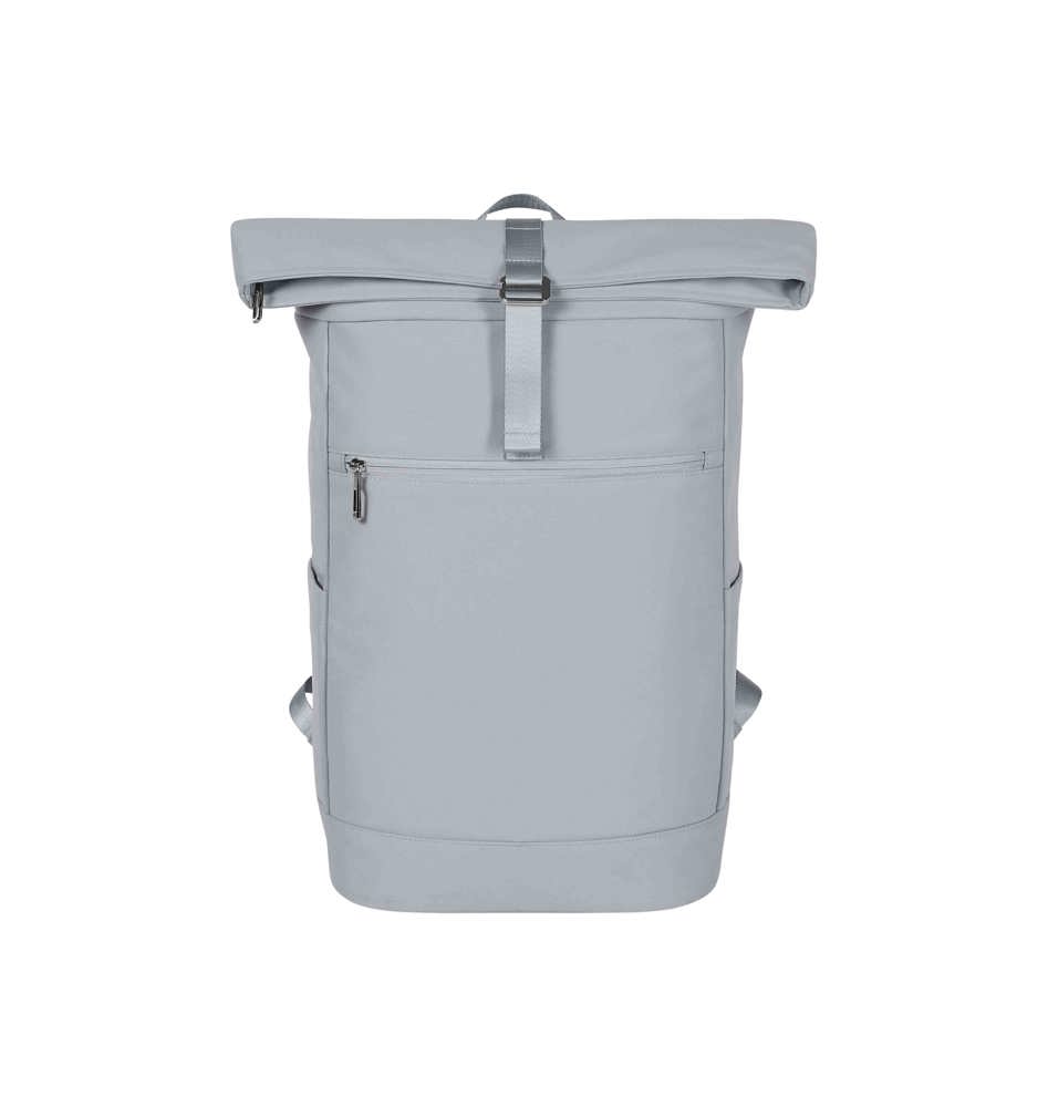 fashionable roll-top backpack; zippered main compartment with adjustable fastening system; loop strap on the lid; high-quality metal accessories; padded notebook compartment; zippered front pocket; two side pockets; padded base; padded carrying system; fastening loop on the back for trolley handle; handle