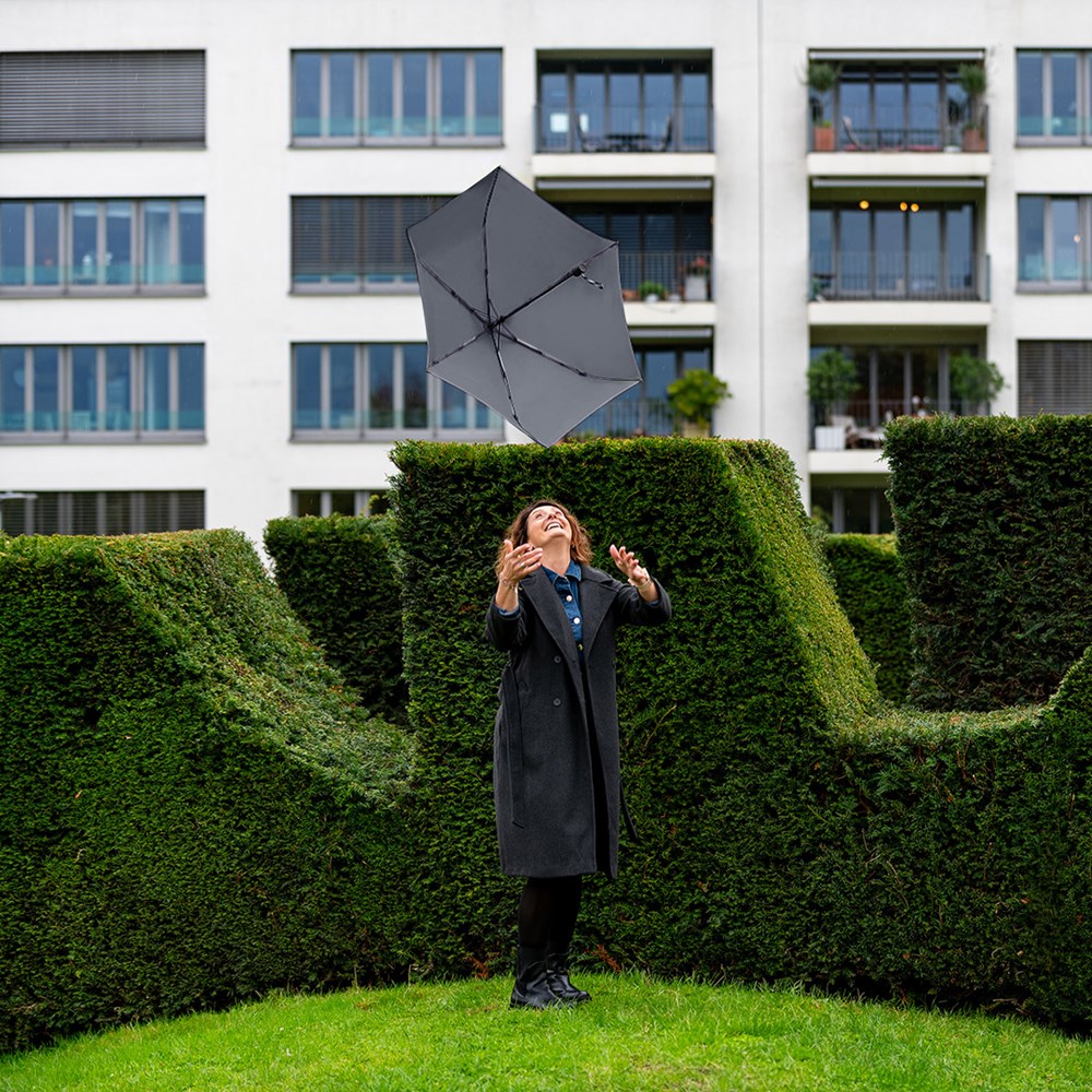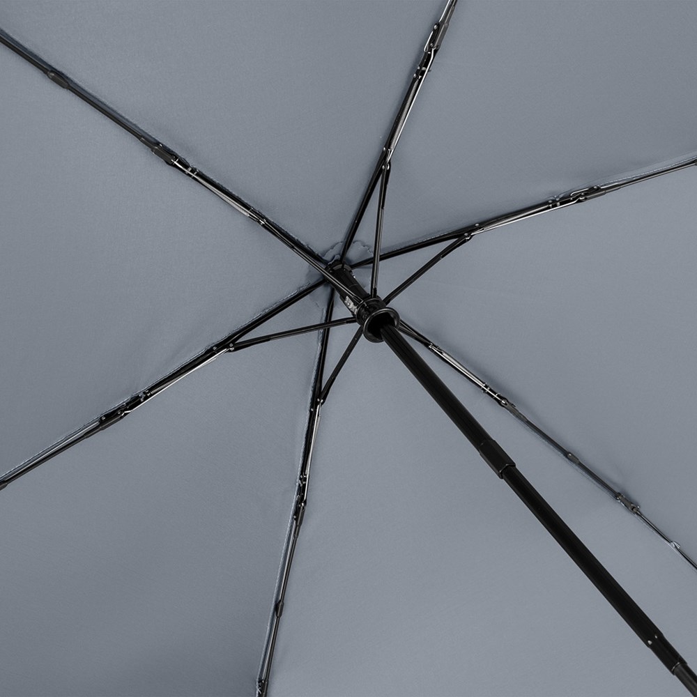 Filigree automatic open/close pocket umbrella in super-light design Convenient automatic function for quick opening and closing, high-quality Windproof PLUS system for maximum frame flexibility in stronger gusts of wind, black aluminium shaft, water-saving coloured polyester pongee waterSAVE® cover material made from recycled plastics, with waterSAVE® label on the closing strap, matt black plastic soft-feel handle with push-button and promotional labelling option, suitable for handbags thanks to super-light weight and compact size