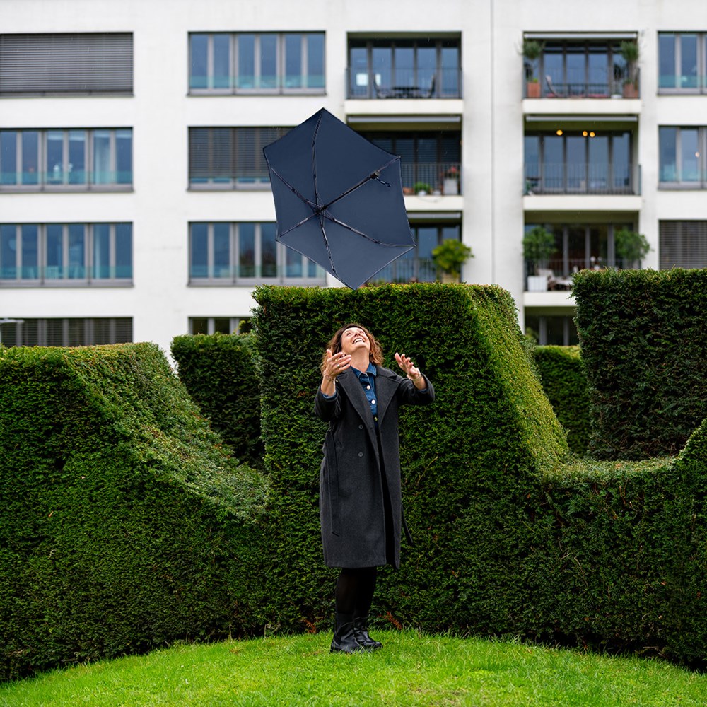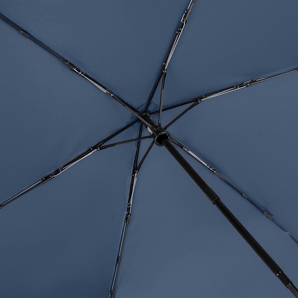Filigree automatic open/close pocket umbrella in super-light design Convenient automatic function for quick opening and closing, high-quality Windproof PLUS system for maximum frame flexibility in stronger gusts of wind, black aluminium shaft, water-saving coloured polyester pongee waterSAVE® cover material made from recycled plastics, with waterSAVE® label on the closing strap, matt black plastic soft-feel handle with push-button and promotional labelling option, suitable for handbags thanks to super-light weight and compact size