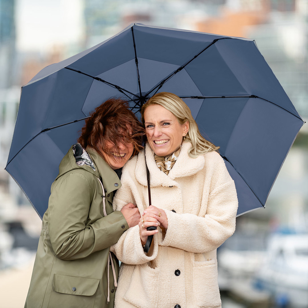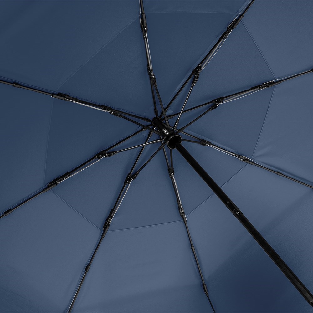 An extremely robust automatic open/close golf pocket umbrella for two people Convenient automatic open/close function for quick opening and closing, high-quality Windproof PLUS system for maximum frame flexibility in strong gusts of wind, flexible fibreglass ribs, Overlapping ventilation cover to regulate excess pressure from strong gusts of wind, water-saving polyester pongee waterSAVE® cover material made from recycled plastics and with fashionable reflective piping in silver, with waterSAVE® label on the closing strap, handle made from recycled ABS (rABS) with integrated push-button and promotional labelling option, comfortable sleeve with high-quality zip, hospitable large diameter