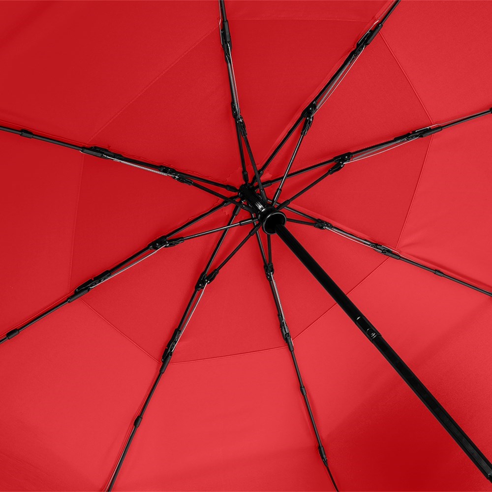 An extremely robust automatic open/close golf pocket umbrella for two people Convenient automatic open/close function for quick opening and closing, high-quality Windproof PLUS system for maximum frame flexibility in strong gusts of wind, flexible fibreglass ribs, Overlapping ventilation cover to regulate excess pressure from strong gusts of wind, water-saving polyester pongee waterSAVE® cover material made from recycled plastics and with fashionable reflective piping in silver, with waterSAVE® label on the closing strap, handle made from recycled ABS (rABS) with integrated push-button and promotional labelling option, comfortable sleeve with high-quality zip, hospitable large diameter