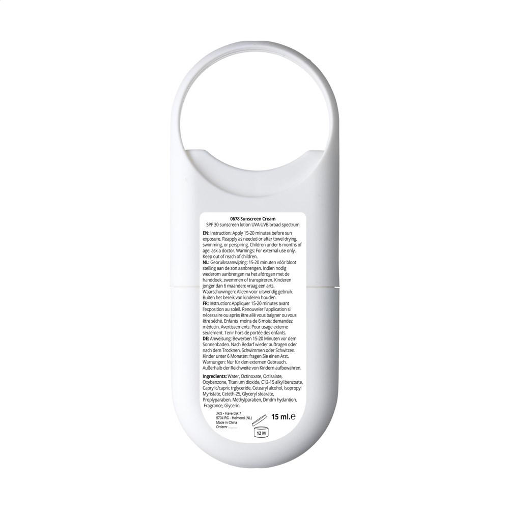 Protective sunscreen lotion (factor 30) in a handy plastic spray stick with vaporizer and large hanging eye. Best before: 12 months after opening. Contents 15 ml. Ingredients: aqua, Octinoxate, Octisalate, Oxybenzone, Titanium dioxide, C12-15 alkyl benzoate, Caprylic/capric triglyceride, Cetearyl alcohol, Isopropyl Myristate, Ceteth-25, Glyceryl stearate, Proplyparaben, Methylparaben, Dmdm hydantoin, Fragrance, Glycerin.