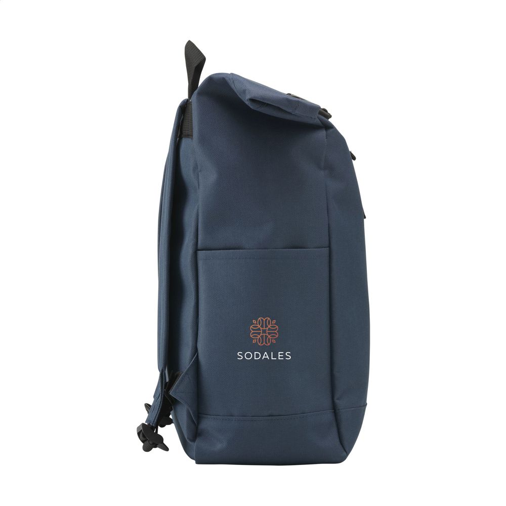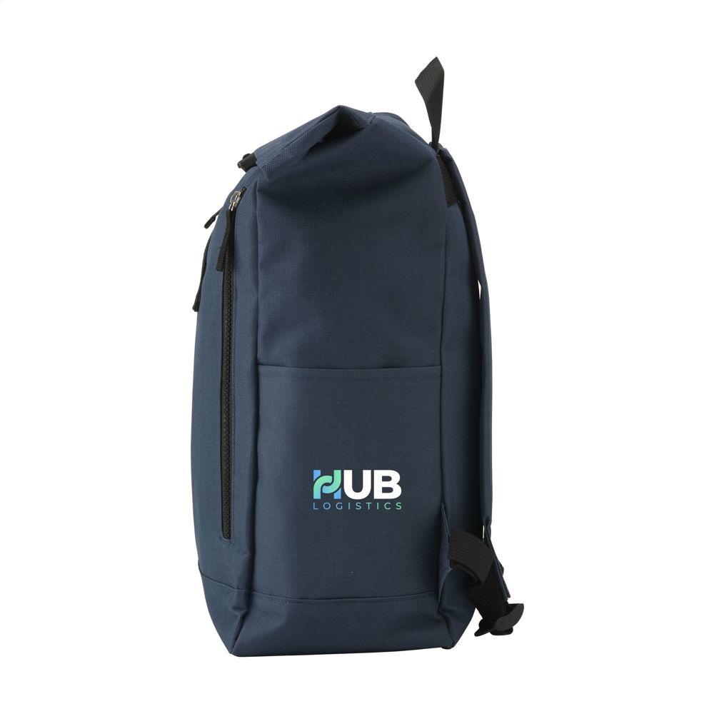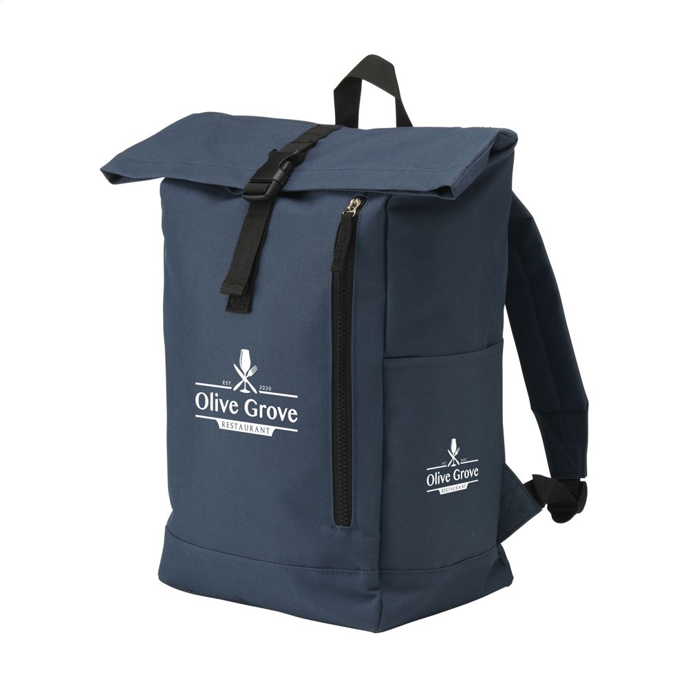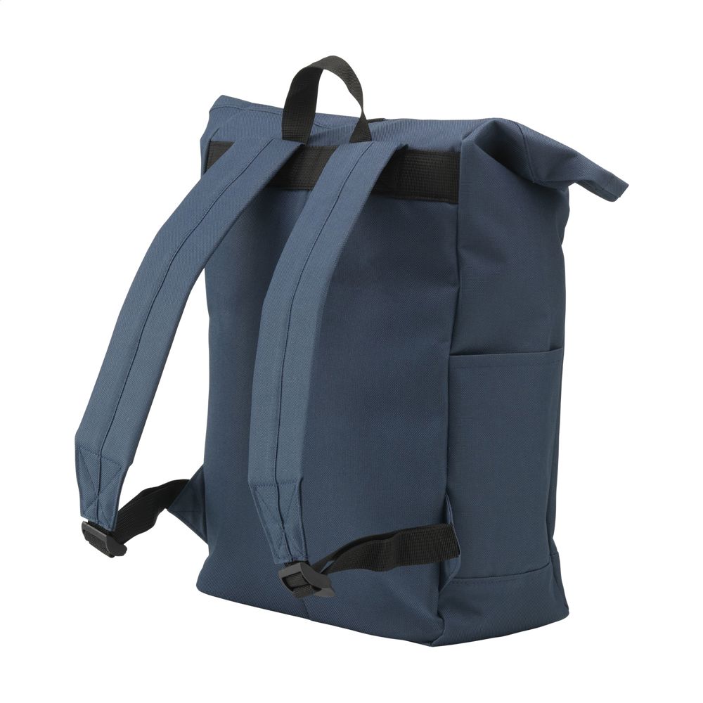 Tough, practical urban 'roll-top' backpack made from strong 600D polyester with water-resistant PVC interior, partially nylon lined. The backpack has one large inner compartment, a pocket on both sides and a large zip pocket on the front. With foam back for increased comfort, padded, adjustable shoulder straps and hand loop. With carrying strap and a roll closure with a handy click system at the top. The perfect bag for daily use. Capacity approx. 18 litres.