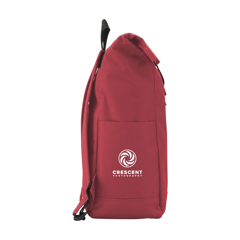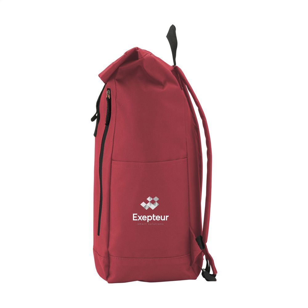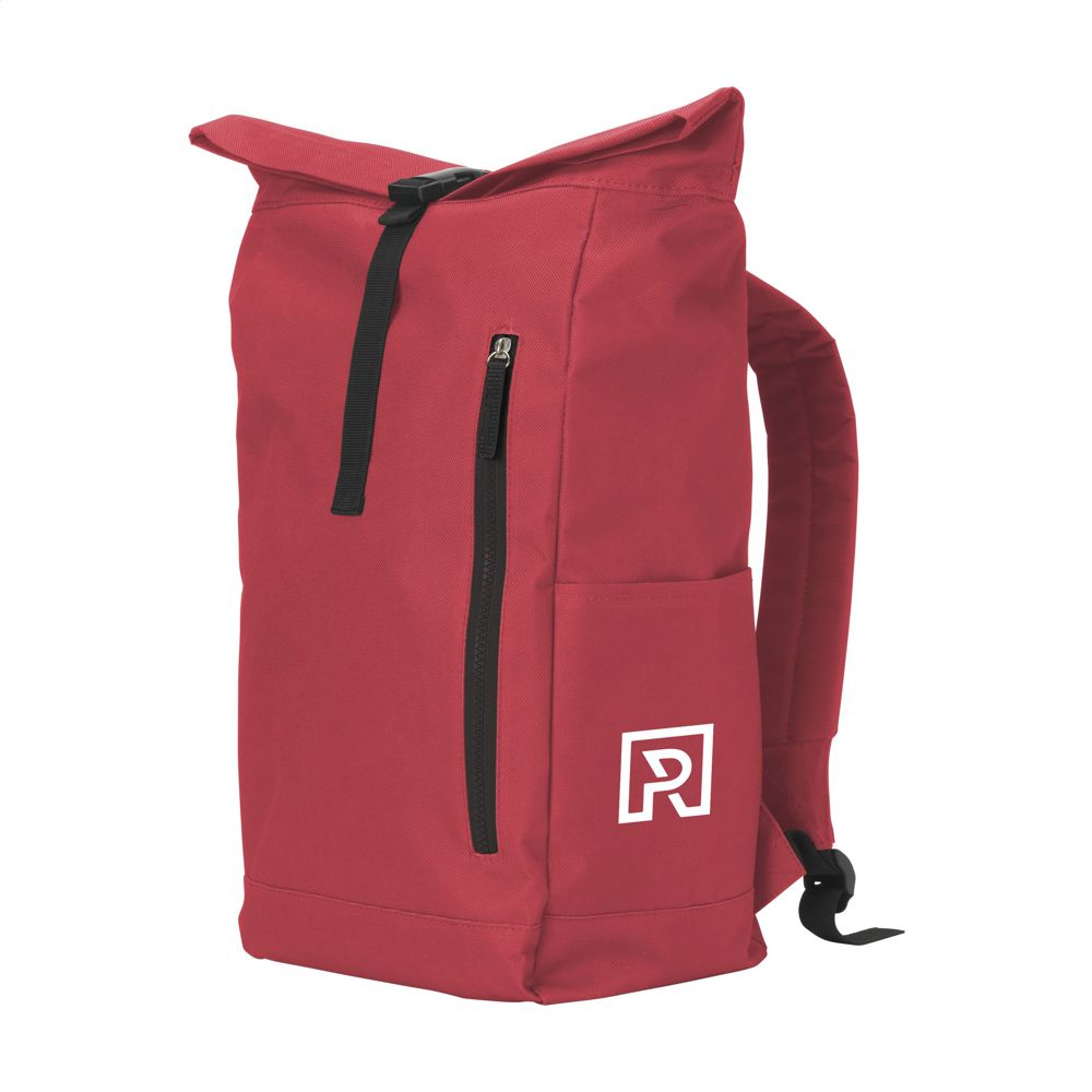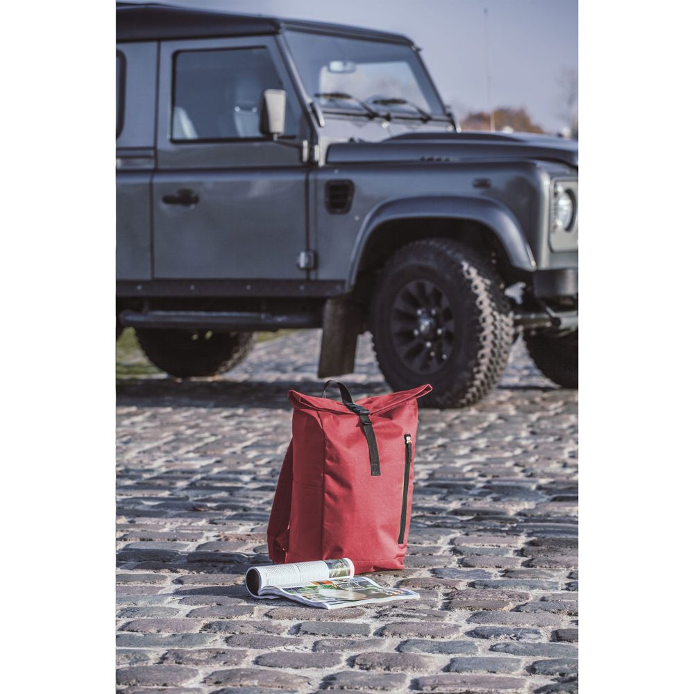 Tough, practical urban 'roll-top' backpack made from strong 600D polyester with water-resistant PVC interior, partially nylon lined. The backpack has one large inner compartment, a pocket on both sides and a large zip pocket on the front. With foam back for increased comfort, padded, adjustable shoulder straps and hand loop. With carrying strap and a roll closure with a handy click system at the top. The perfect bag for daily use. Capacity approx. 18 litres.