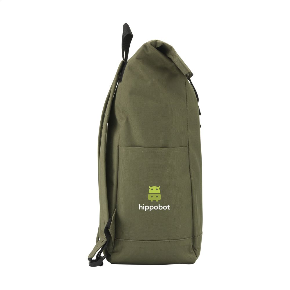 Tough, practical urban 'roll-top' backpack made from strong 600D polyester with water-resistant PVC interior, partially nylon lined. The backpack has one large inner compartment, a pocket on both sides and a large zip pocket on the front. With foam back for increased comfort, padded, adjustable shoulder straps and hand loop. With carrying strap and a roll closure with a handy click system at the top. The perfect bag for daily use. Capacity approx. 18 litres.