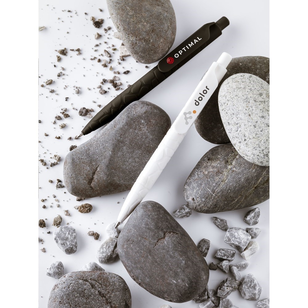 Blue ink ballpoint pen with push button. Made from 55% PP plastic and 45% natural stone. The pen has a beautiful design with a stone structure.