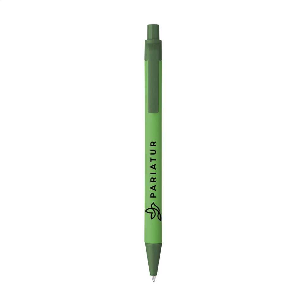 Bblue ink ballpoint pen with a barrel made from recycled paper. The clip, push button and point are made from biodegradable PLA.