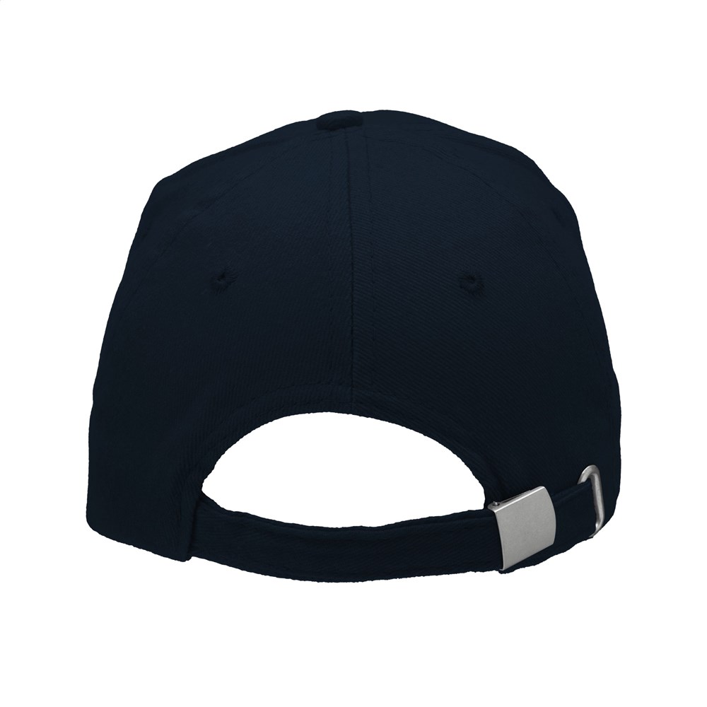 Sturdy baseball cap made from 100% combed high quality cotton, pre-shaped peak and adjustable metal clip fastener at the back.