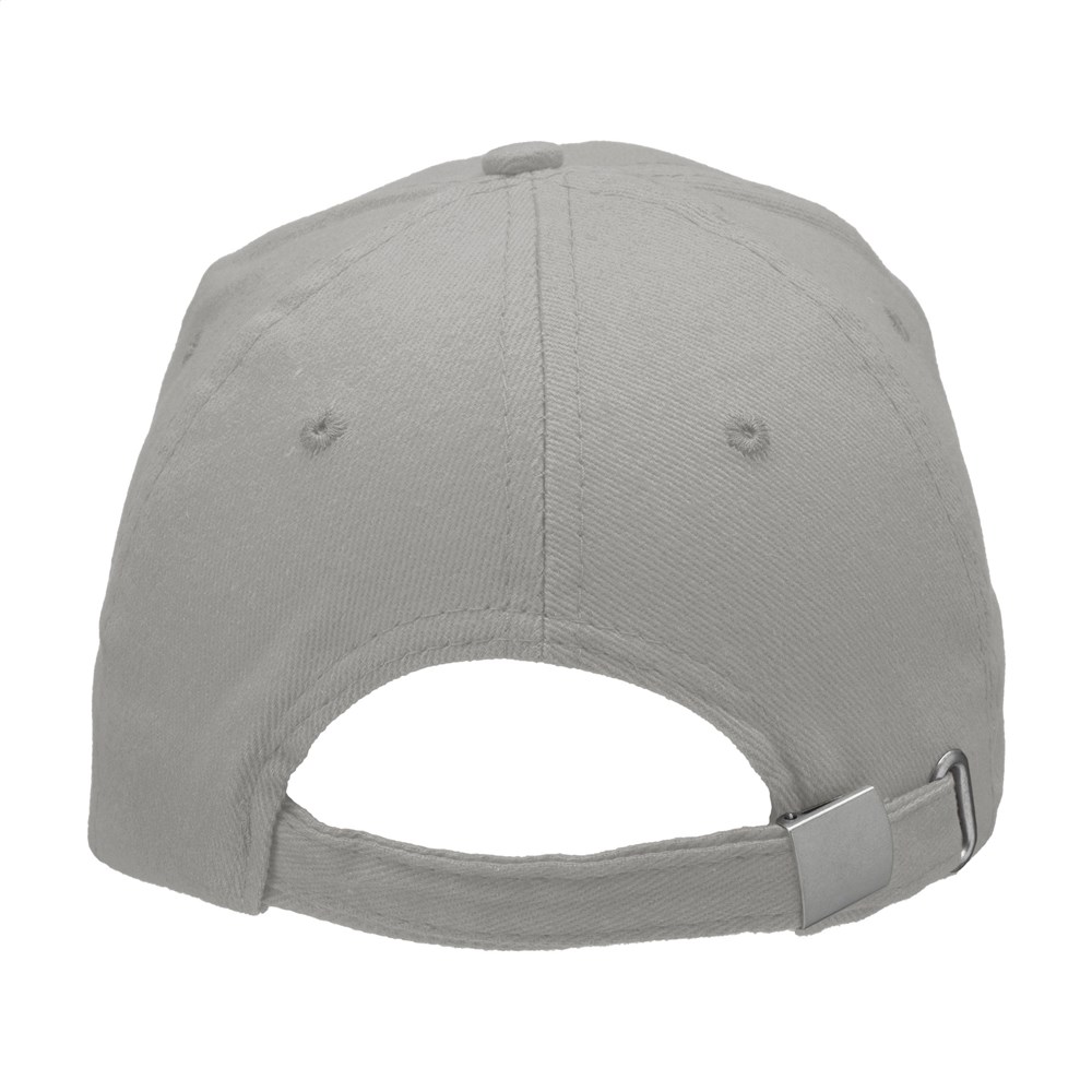 Sturdy baseball cap made from 100% combed high quality cotton, pre-shaped peak and adjustable metal clip fastener at the back.