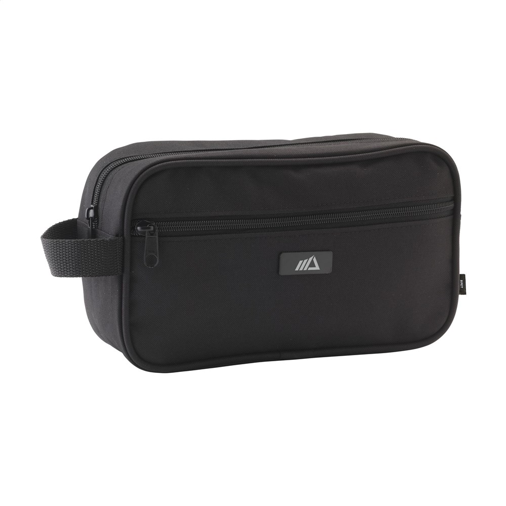 Large toiletry bag with zipper. Made from 600D RPET: recycled material made from PET bottles. With carrying strap and front pocket with zipper. The metal label on the front makes this product ideal for personalisation.