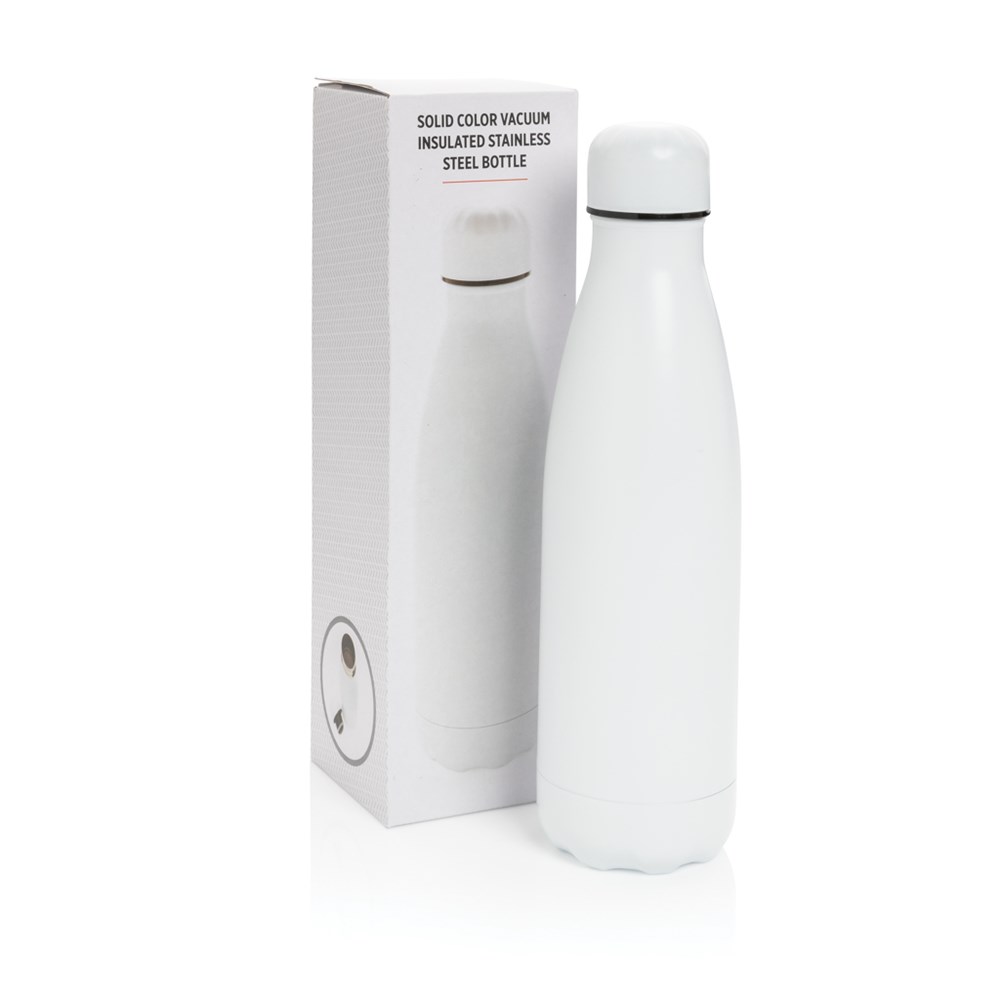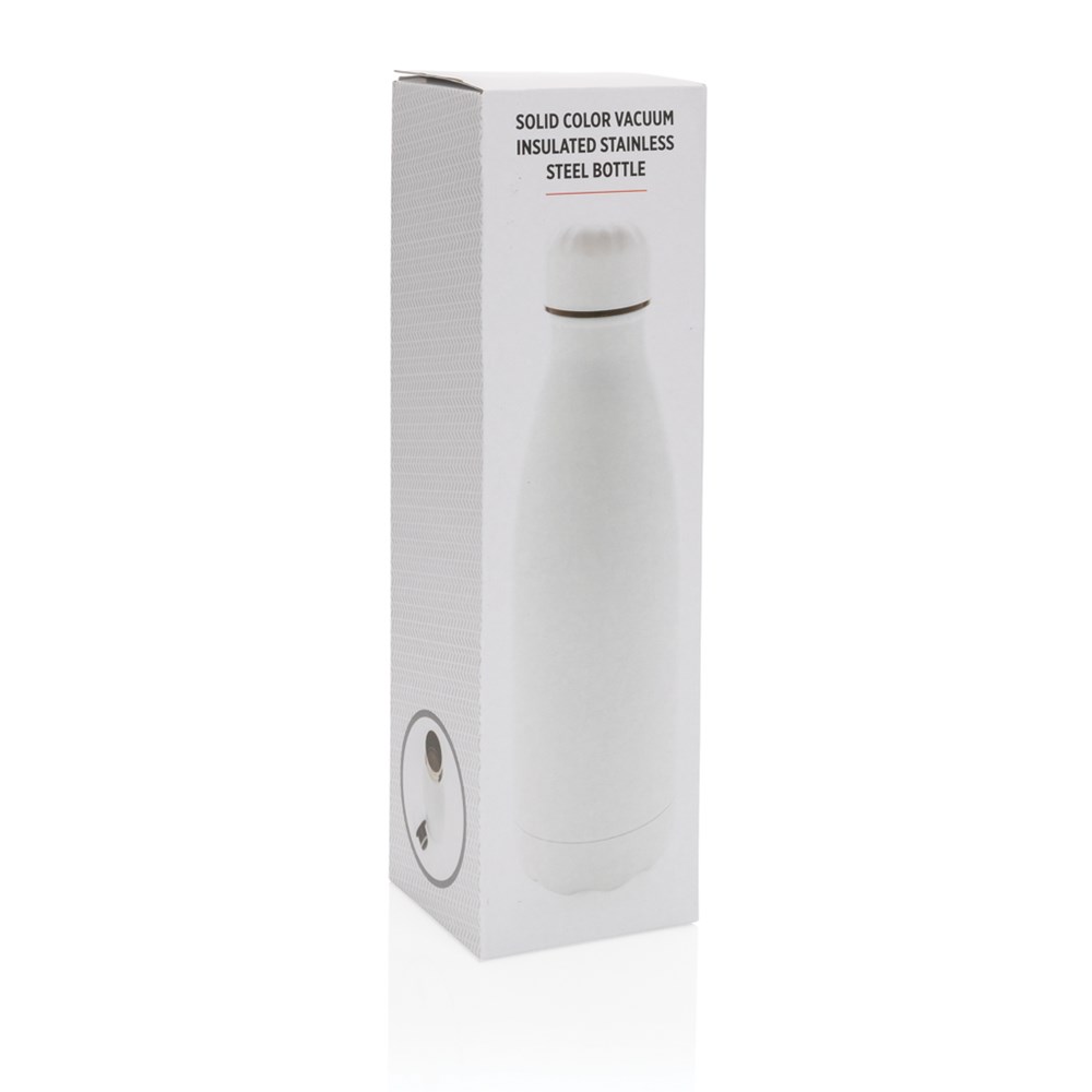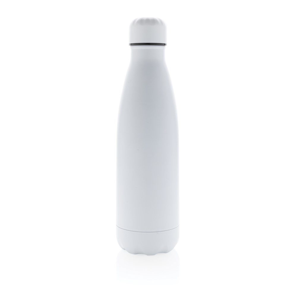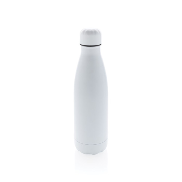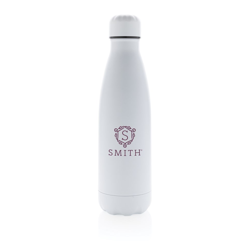 Elevate your daily water intake with this solid colour vacuum insulated stainless steel bottle. The bottle keeps chilled beverages cold for up to 15 hours and hot drinks warm for up to 5 hours. With a base that fits in most cup holders, this sleek looking water bottle will keep you hydrated on the go wherever you are. Capacity 500ml.