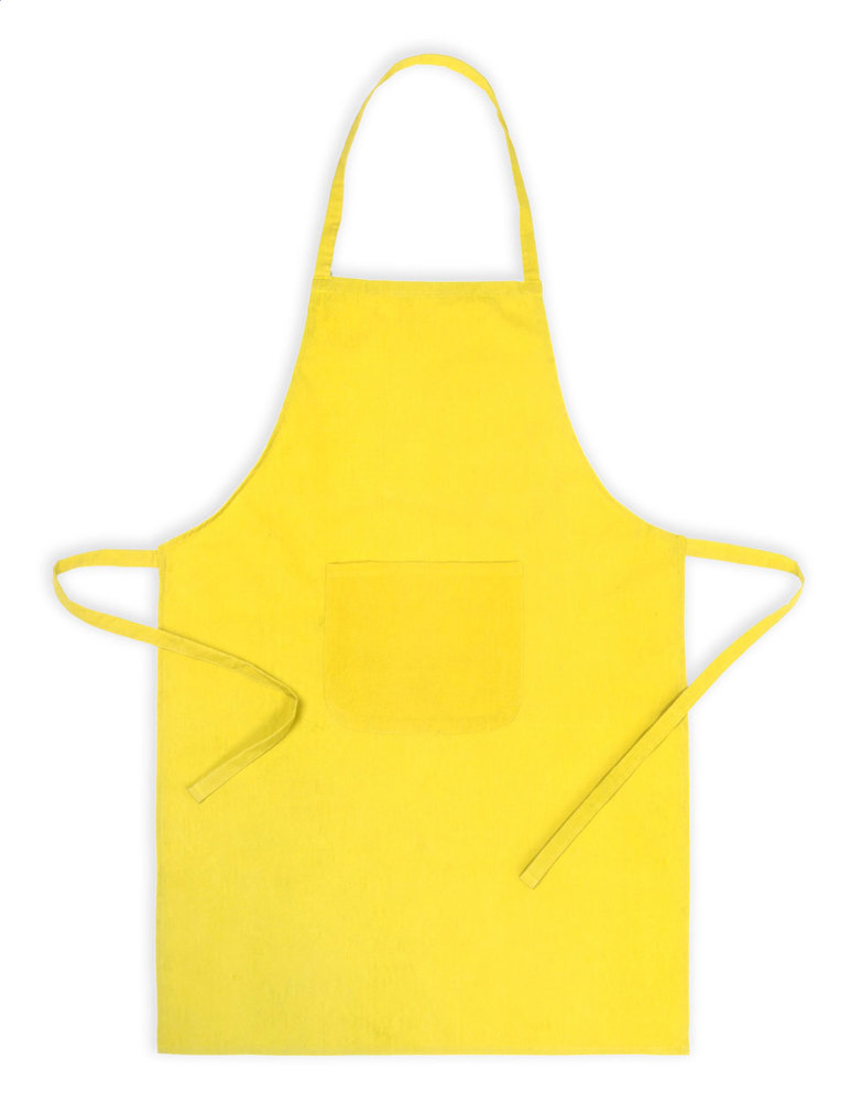 Coloured apron with front pocket, made of 35% cotton / 65% polyester blend.