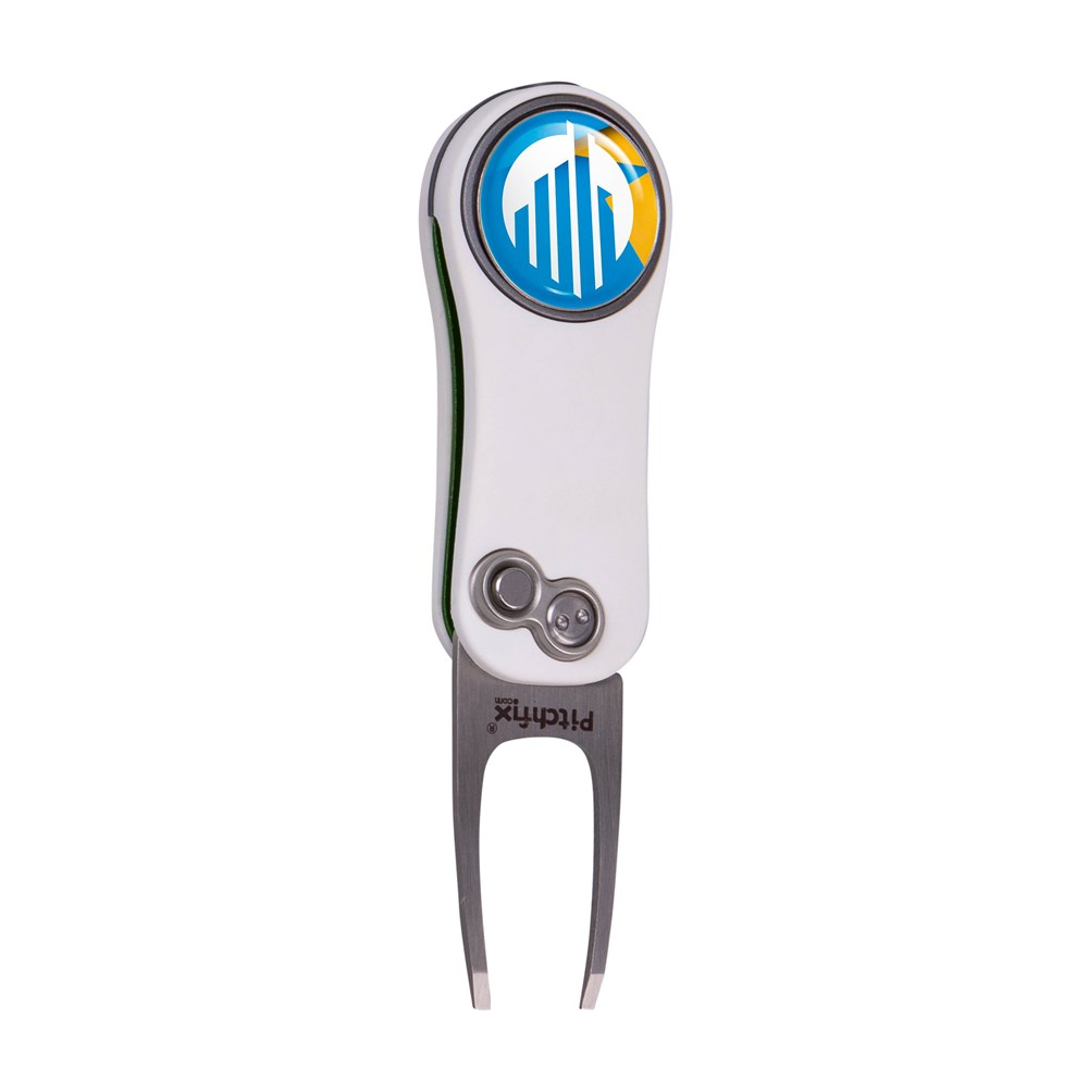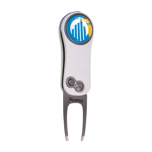 Lightweight, automatic fold-in pitchfork made of aluminium with ABS rubber handles, equipped with a magnetic ball marker with doming and pencil sharpener