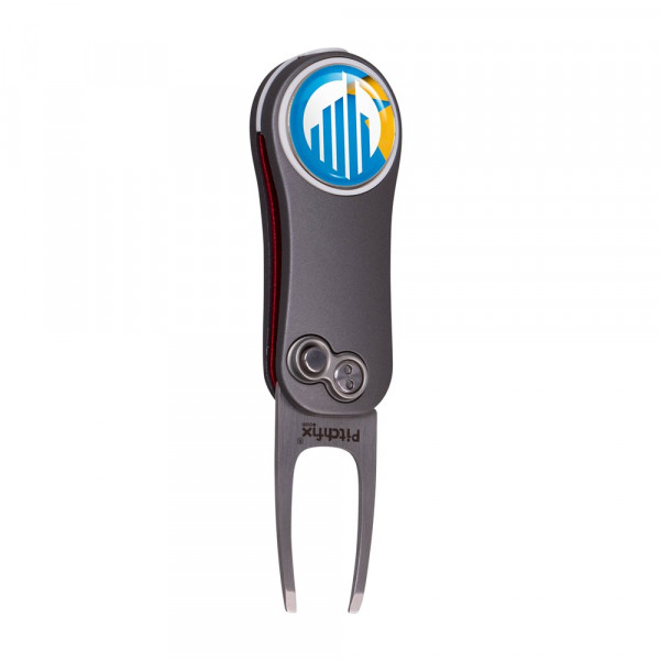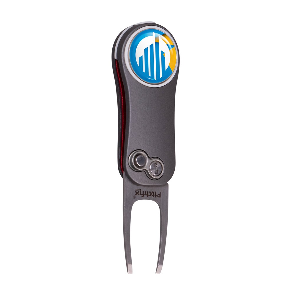 Lightweight, automatic fold-in pitchfork made of aluminium with ABS rubber handles, equipped with a magnetic ball marker with doming and pencil sharpener