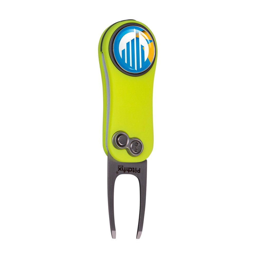 Lightweight, automatic fold-in pitchfork made of aluminium with ABS rubber handles, equipped with a magnetic ball marker with doming and pencil sharpener