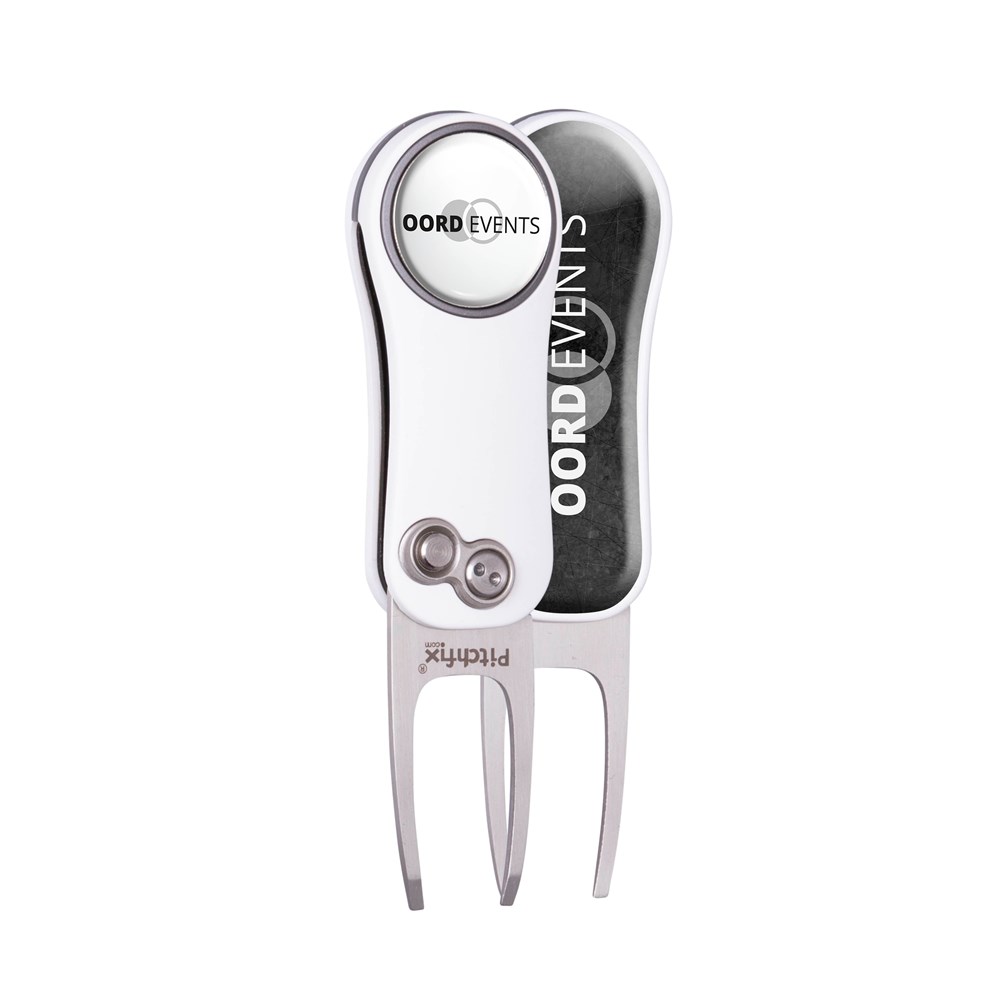 Lightweight, automatic fold-in pitchfork made of aluminium with ABS rubber handles, equipped with a magnetic ball marker with doming and a large doming at the back