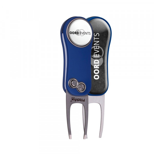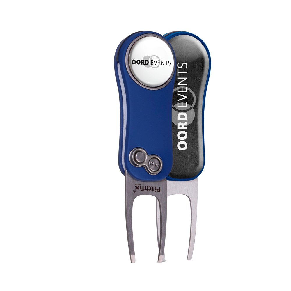 Lightweight, automatic fold-in pitchfork made of aluminium with ABS rubber handles, equipped with a magnetic ball marker with doming and a large doming at the back