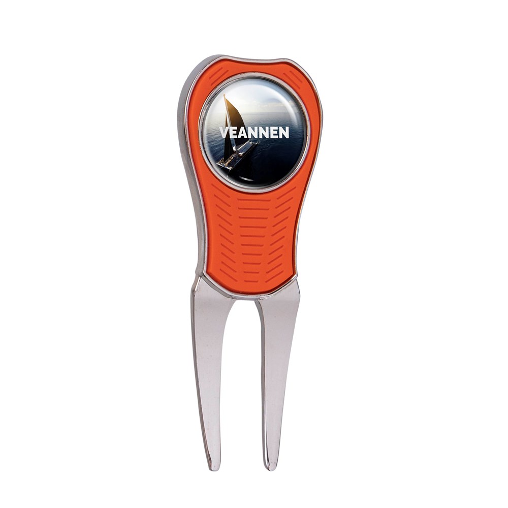 Metal pitchfork with rubber grip, equipped with a magnetic ball marker with doming