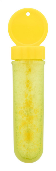 Bubble blower in coloured plastic. With 30 ml bubble liquid.