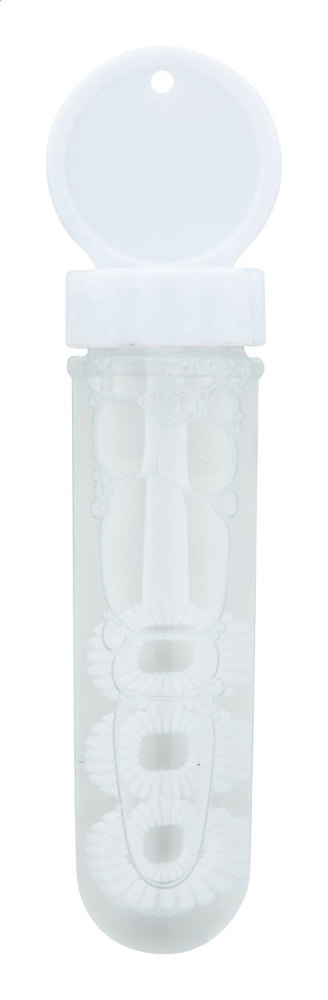 Bubble blower in coloured plastic. With 30 ml bubble liquid.