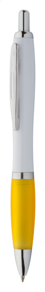Plastic ballpoint pen with white barrel, coloured grip and shiny chrome parts. With blue refill.