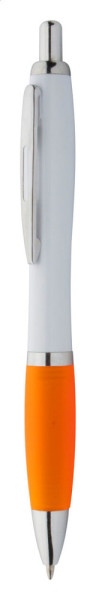 Plastic ballpoint pen with white barrel, coloured grip and shiny chrome parts. With blue refill.