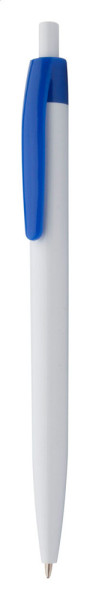 Plastic ballpoint pen with white barrel and coloured clip. With blue refill.