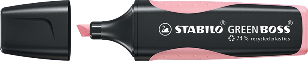 A GLOWING GREEN CONSCIENCE. Highlighter made of 74% recycled plastics; classic STABILO BOSS shape with soft ergonomic grip zone. 2 line widths, refillable ink in 4 trendy pastel shades. With anti-dry-out technology: 4 hours of protection from drying-out. Also available in 4 vivid luminous colours.