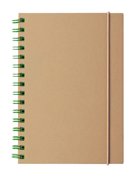Recycled cardboard covered spiral notebook with rubber strap. 80 lined sheets, A5 size.