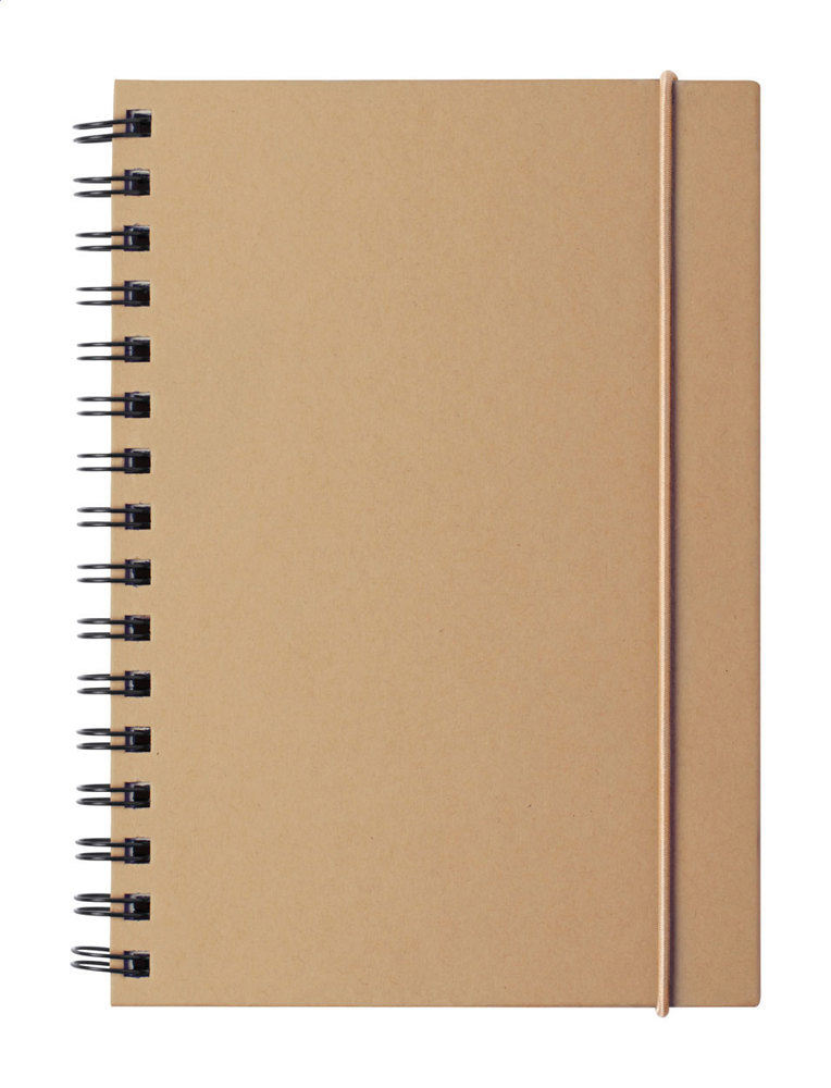Recycled cardboard covered spiral notebook with rubber strap. 80 lined sheets, A5 size.
