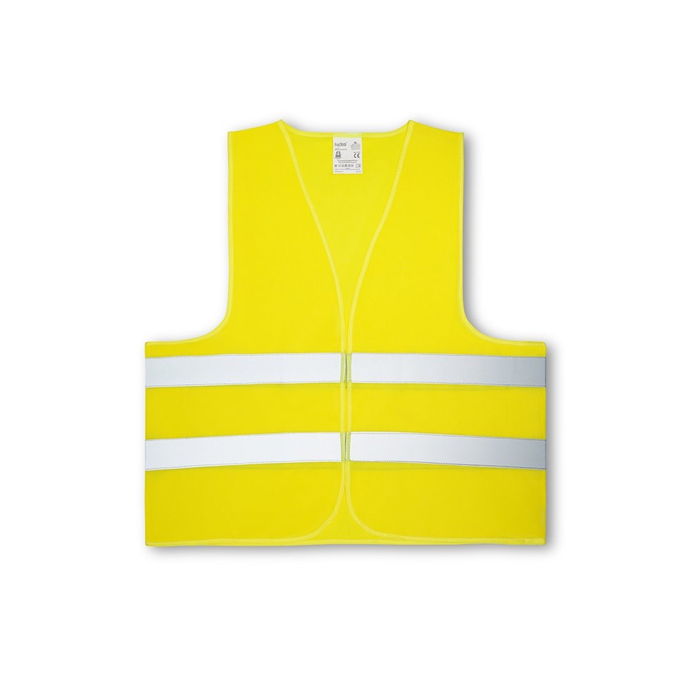 100% polyester high visibility vest certified with EN ISO 20471 class 2. Reflective vest with 2 horizontal reflective bands and a self-adhesive hook and loop fastener front opening. One size: 670 x 700 mm