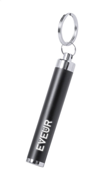 Plastic flashlight with 1 LED and metal keyring. Logos engraved on body are illuminated. Including button cell batteries.