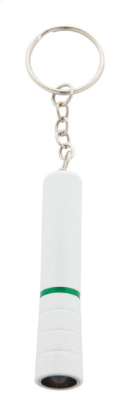 Plastic, mini flashlight with 1 LED and metal keyring. With button cell battery.