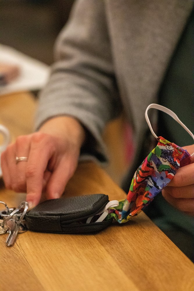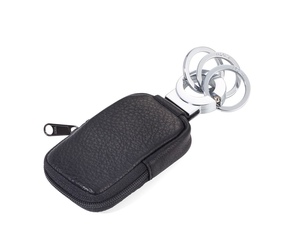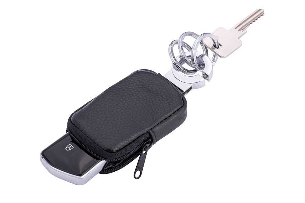 Keyring With pocket for small change, APPLE AirTag®, shopping cart chip, for example, zipper, 3 metal rings for keys, practical "click-lock", leather, metal, shiny, black