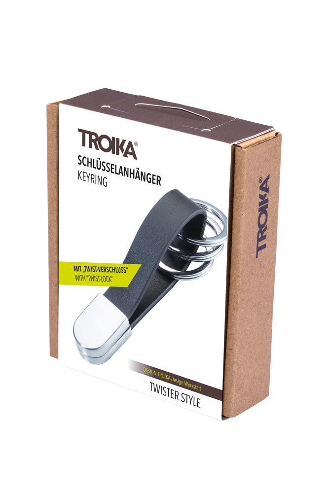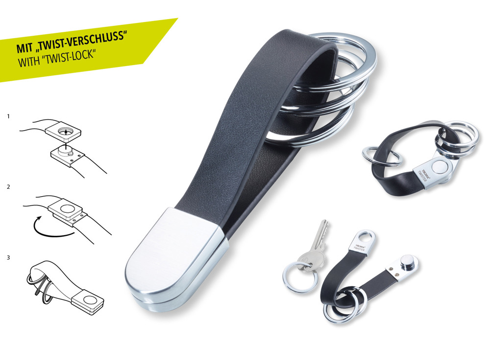 Keyring with rounded "twist-lock", leather loop, 3 keyrings, cast metal, leather, chrome plated,... more
