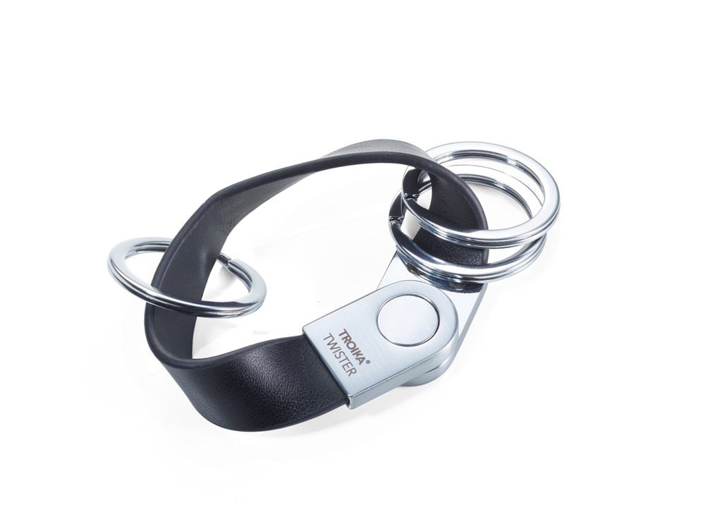 Keyring with rounded "twist-lock", leather loop, 3 keyrings, cast metal, leather, chrome plated, matt, black