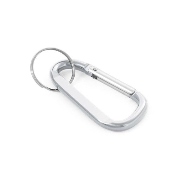Aluminium carabiner, with keyring and flat area for customisation. Product not suitable for climbing. Ring: ø 25 mm | Product: 60 x 32 x 5 mm | Total: 80 x 32 x 5 mm