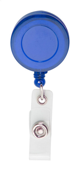Plastic badge holder with press-stud closure, telescopic line and metal clip.