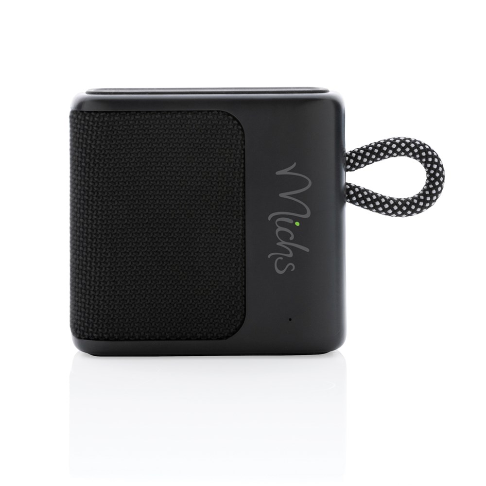 IPX 6 waterproof 3W speaker made from ABS and fabric. The 1200 mah battery allows a play time of up to 5 hours. Re-charging takes 3 hours. Operating distance up to 10 metres using BT 5.1 With mic and pick up function to answer calls. With type C input port and type C charging cable.