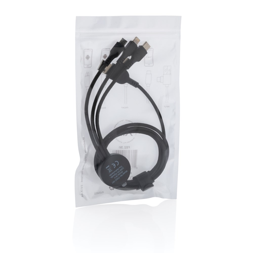 Braided nylon multi cable with 5 different connectors: USB C in, USB A in, type C out, IOS out and micro USB out. This allows you to use the cable also with type C output devices that are included in the newer generation of phones and macbook computers. The cable also has a USB A output input option so it can charge any device from any output source. ABS casing with option to engrave your logo that will light up when the cable is being used. PVC free. Lenght 120 cm.