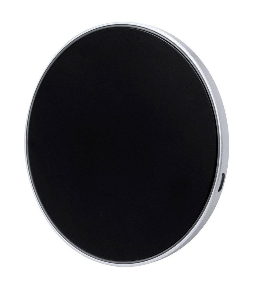 Wireless charger (5W) with plastic housing and LED light inside the housing for illuminated engraving. Including USB charger cable.
