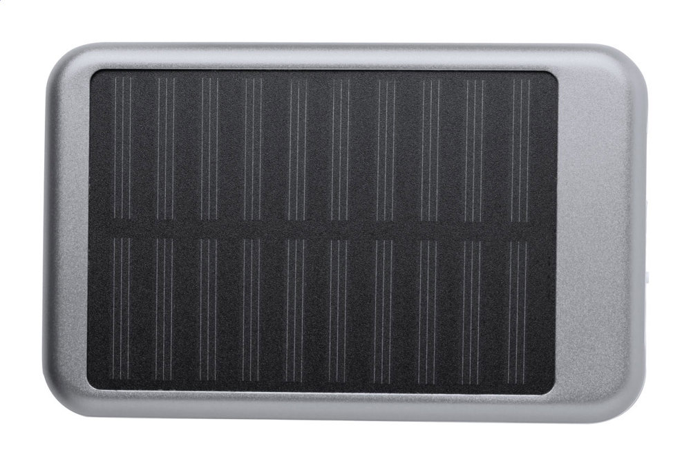 Aluminium USB power bank with 4000 mAh battery and built-in solar charger. Including micro USB charger cable.