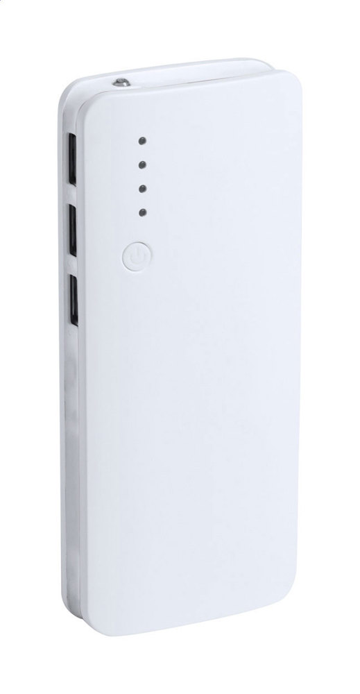 Plastic USB power bank with 3 charger ports and 10000 mAh battery. Without charger cable.